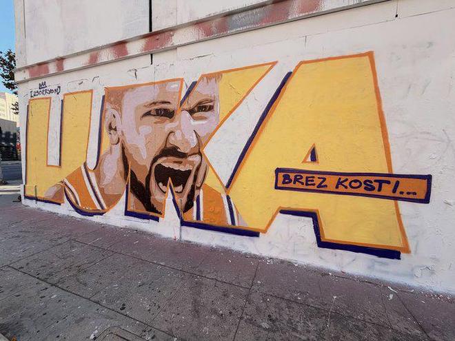此前,有藝術(shù)家在街頭的墻上制作了科比和東契奇握手的壁畫(huà)。